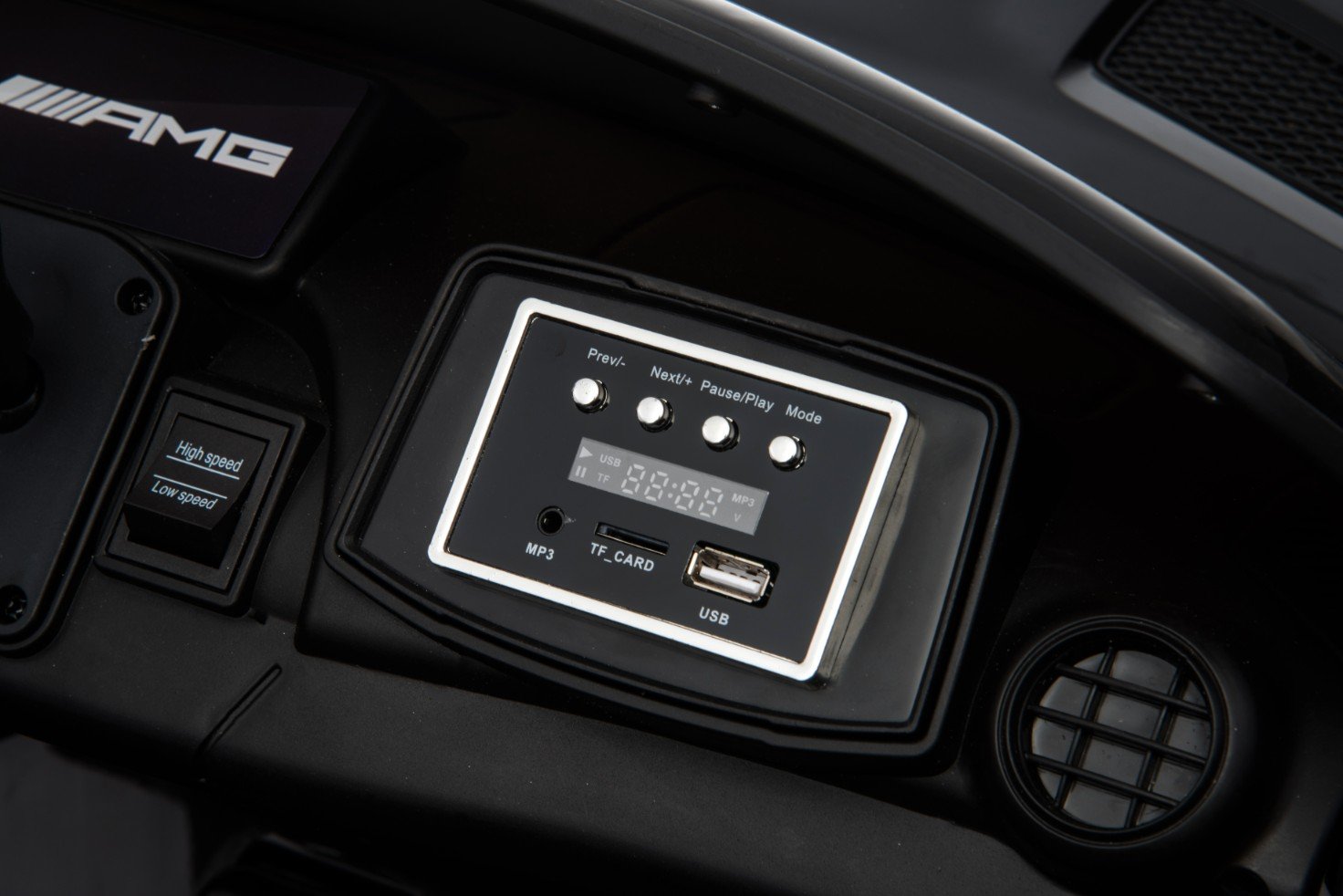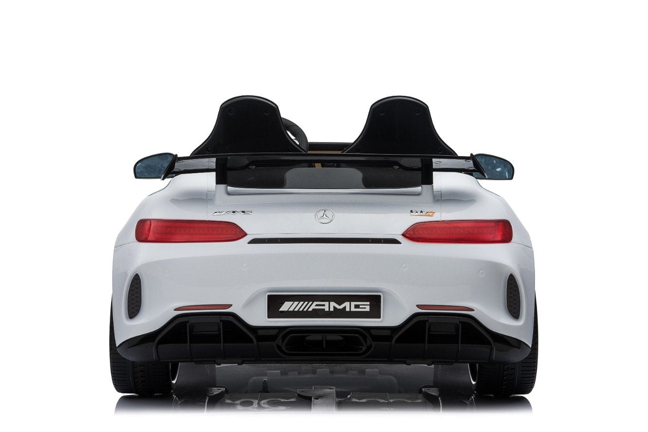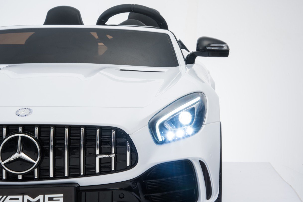 Remote control ride on Mercedes-Benz GTR two seat ride on car for toddlers. This beautiful toddler Mercedes-AMG GT-R sports car comes with all the goodies like leather seats for two riders, big 10" rubber tires, glossy paint and opening doors. So just push the button on the dash to fire up your new Mercedes. Take a look at all the features below. We offer our exclusive 1 year warranty* on this fantastic remote control ride on GTR Benz.