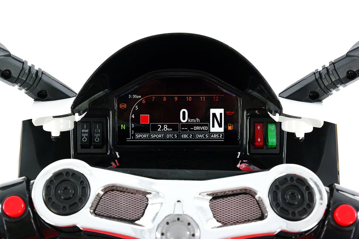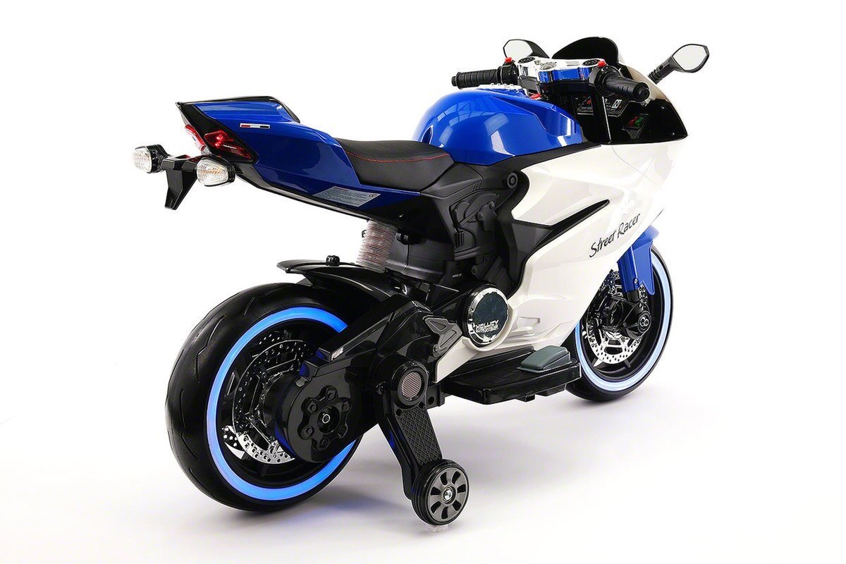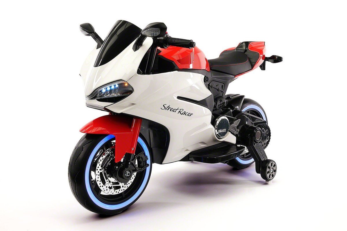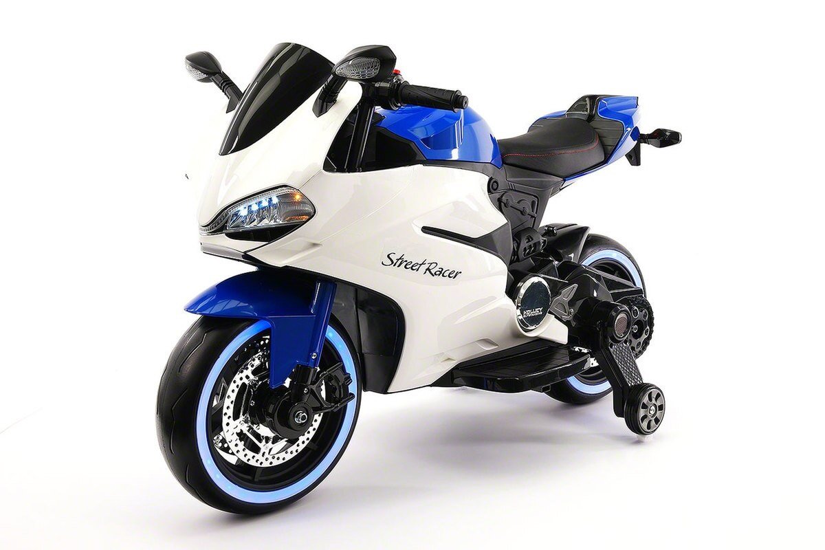 Hop on your street racer and jet down the block on this cool motorcycle with leather seat and hot LED headlights, tail lights and even in the rims. With two twelve volt motors ages three to six years old will have a blast on this street racing style bike for kids. With the leather seat, integrated sound, foam rubber tires and even training wheels if needed this is a loaded machine ready action.
