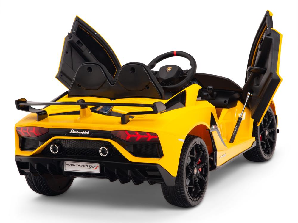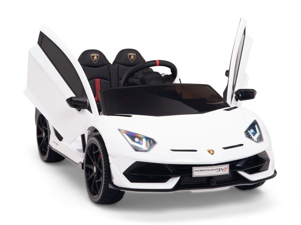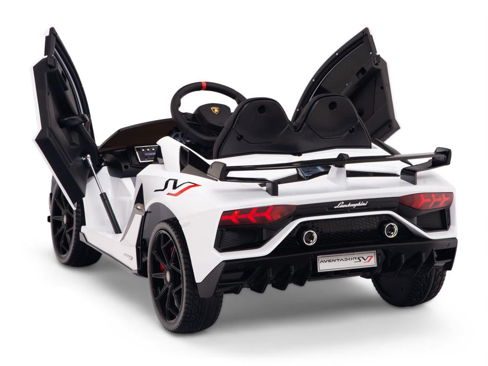 The new Aventador Super Veloce Jota car received this name because of its super fast speeds and one-of-a-kind extreme experiences that it offers. Of course we had to tone down the toddler version, but this miniaturized remote control ride on sports car looks. Of course this mini Lambo comes with all the luxurious amenities starting with the dihedral doors opening to a beautiful leather seat with a dash full of inputs for tunes and engine start sounds all sitting on spring suspension and rubber tires. Here at Car Tots you will get a 1 year warranty* so you can enjoy your new Lamborghini Aventador.